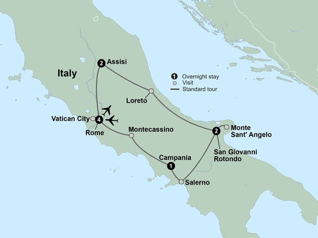 Travel across the Apennine Mountains to the Marian shrine of Loreto. Discover the Holy House of Nazareth and the beautiful Madonna of Loreto where more than 50 popes have made a pilgrimage. Celebrate Mass before continuing your journey to San Giovanni Rotondo, home of St. Padre Pio.