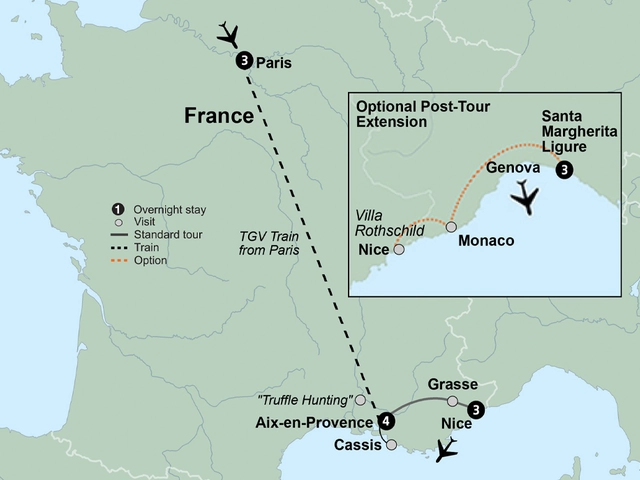 The wine, cuisine, art, and landscapes of France ignite the senses on a journey to romantic Paris, colorful Provence, and the sparkling French Riviera. Relax during extended stays in Paris, Aix-en-Provence, and Nice. Travel by high-speed train from Paris to Provence and visit a farm for a cheese tasting. Stroll the spectacular gardens of the Villa Rothschild with their stunning views of the Mediterranean. Cruise the River Seine, learn about perfume making and truffle hunting, and explore charming villages and gorgeous coastlines – this is the essence of France.