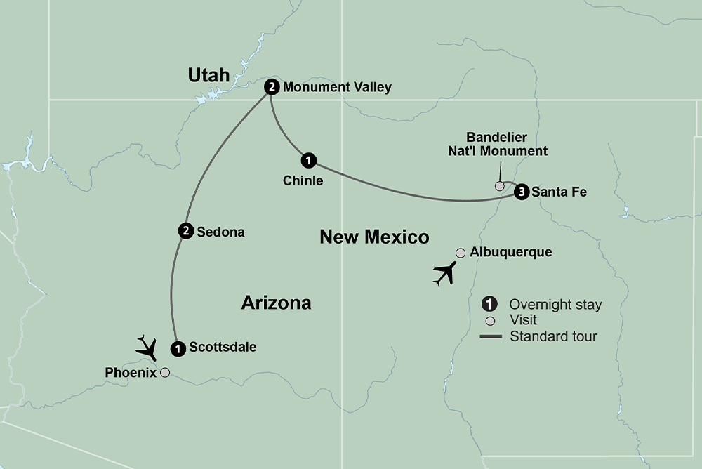 Journey through the American Southwest’s storied landscapes, where striking canyons and red-rock formations are woven with ancestral histories and enduring Indigenous traditions. Get to know Santa Fe’s historic plaza on a locally guided walking tour, and explore Bandelier National Monument, home to cliff dwellings and village ruins from Ancestral Puebloans. Visit the mesa-top Acoma Pueblo, continuously inhabited for nearly 1,000 years. Within Navajo Nation, take in the painted hues of Canyon de Chelly as your Navajo guide shares stories and history. Marvel at the towering monoliths of Monument Valley, and savor a traditional BBQ dinner under desert skies. Stay in Sedona and Scottsdale, two lively cities nestled within desert scenery. From desert cities to ancestral lands, explore the spirit of the region.