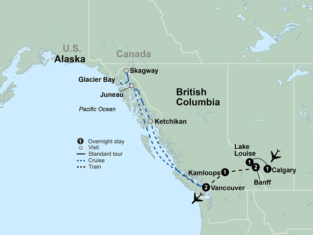 Get ready for an adventure that highlights the soaring majesty of the Canadian Rockies, the emerald-green forests of British Columbia, and the grandeur of Alaska’s Inside Passage. Discover the cowboy spirit of Western Canada with a stop at a local ranch for a line dancing lesson and a wagon ride in search of buffalo. Marvel at the impressive waterfalls, rushing rivers, glacial peaks, imposing cliffs, and snowcapped mountain ranges of Icefields Parkway. Relive Alaska's Gold Rush days in historic Skagway. Cruise through Glacier Bay, a spectacular national park and preserve that’s a treasure trove of tidewater glaciers and scenic coastal islands. Spot humpback whales, orcas, bald eagles, and brown bears as you cruise along the magnificent Inside Passage.