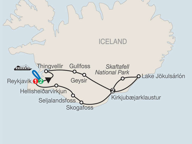 Scenic highlights include Iceland’s most famous waterfall, mighty Gullfoss, which plummets down 105 feet over two stages into a rugged canyon. Drive through the national park at Skaftafell and stop at Lake Jökulsárlón, the deepest lake in Iceland. Watch how Europe's largest glacier, Vatnajökull, flows into the lake and forms icebergs. Another scenic drive gives you the opportunity to see Skogafoss Waterfall, one of Iceland’s biggest waterfalls, and Seljalandsfoss Waterfall, which is a unique waterfall with a foot path behind it.