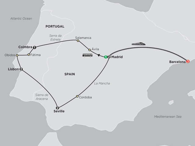 ÁVILA VisitSALAMANCA VisitCOIMBRA OrientationFÁTIMA Visit the SanctuaryOBIDOS Visit the fortified cityLISBON Guided sightseeingSEVILLE Guided sightseeingMADRID Guided sightseeing