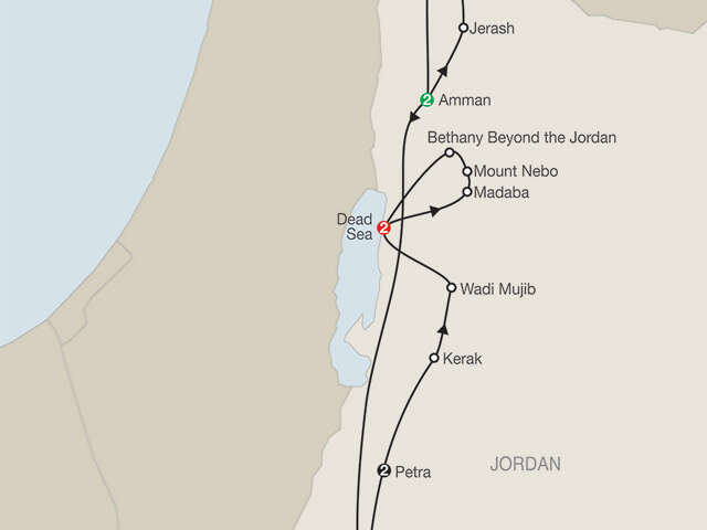 AMMAN Welcome dinner; guided sightseeing, visit the amphitheater; excursion to Jerash and Umm QaisWADI RUMVisit the largest wadi in Jordan and [LF] enjoy a four-wheel drive to the desert of Wadi Rum and receive a local scarfPETRAGuided sightseeing, including [LF] the Siq and the Treasury; sip tea in a Bedouin tentKERAKVisit the Crusader CastleWADI MUJIBVisit the Jordanian Grand CanyonMADABAVisit St. George’s Church and the Archaeological MuseumMOUNT NEBOVisit the mountain where Moses saw the Promised LandBETHANY BEYOND THE JORDANVisit the site of John the Baptist’s settlementDEAD SEAFarewell dinner