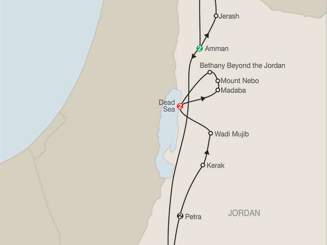 AMMAN Welcome dinner; guided sightseeing, visit the amphitheater; excursion to Jerash and Um QuaisWADI RUM Visit the largest wadi in Jordan and [LF] enjoy a four-wheel drive to the desert of Wadi Rum and receive a local scarfPETRA Guided sightseeing, including [LF] the Siq and the Treasury; sip tea in a Bedouin tentKERAK Visit the Crusader CastleWADI MUJIB Visit the Jordanian Grand CanyonMADABA Visit St. George’s Church and the Archaeological MuseumMOUNT NEBO Visit the mountain where Moses saw the Promised LandBETHANY BEYOND THE JORDAN Visit the site of John the Baptist’s settlementDEAD SEA Farewell dinner