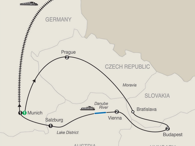 MUNICH Welcome dinner; orientation including Marienplatz; [LF] visit the famous Hofbräuhaus; farewell dinnerPRAGUE Guided sightseeing, visit the Hradčany Castle grounds, see the Astronomical ClockBRATISLAVA Visit the capital of SlovakiaBUDAPEST Guided sightseeing, a panoramic view from Fishermen’s Bastion, visit Matthias Coronation ChurchVIENNA Guided sightseeing, visit St. Stephen’s CathedralDANUBE CRUISE [LF] (Departures April 9-October 1) Enjoy Kaffee und Kuchen (coffee and cake) on boardSALZBURG Guided walking tour, visit Mirabell Gardens and Residenz Square; a special dinner at St. Peter Stiftskeller restaurantMUNICH-BERLIN By high-speed TrainBERLIN Guided sightseeing of historic landmarks. Take pictures of Holocaust Memorial & Brandenburg GateHeadsets throughout the tour