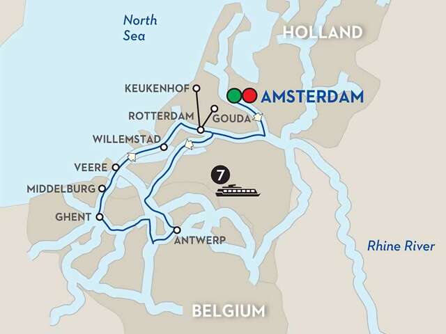 Day 1 Amsterdam (Embarkation): onboard welcome receptionDay 2 Rotterdam. Excursion to Keukenhof: Rotterdam harbor cruise; choice of half-day or extended visit to Keukenhof Gardens; onboard beer lecture and tastingDay 3 Antwerp: guided sightseeingDay 4 Ghent: guided sightseeing, visit St. Baaf’s CathedralDay 5 Excursion to Middelburg & Delta Works: guided walk in Middelburg; guided visit of the Delta Works; special onboard food and beer pairing dinnerDay 6 Willemstad: time at leisure; onboard beer lecture and tastingDay 7 Amsterdam: canal cruise; visit the Heineken Beer BreweryDay 8 Amsterdam (Disembarkation): your vacation ends this morning