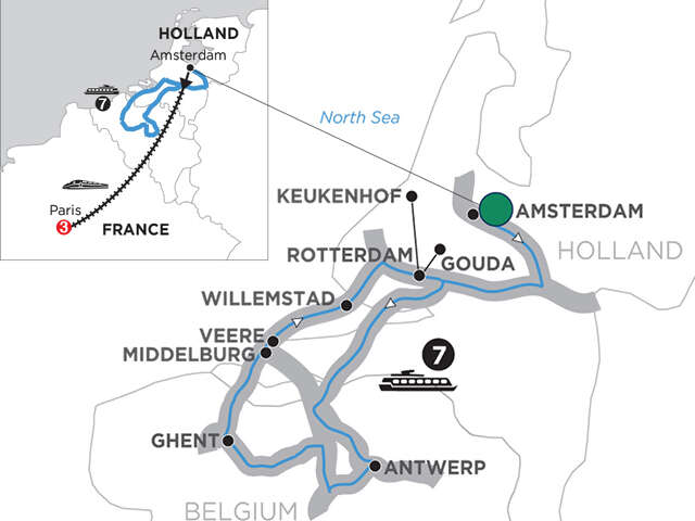 Day 1 Amsterdam (Embarkation): onboard welcome receptionDay 2 Rotterdam. Rotterdam harbor cruise: choice of guided sightseeing in Gouda, or visit to Keukenhof Gardens, onboard beer tastingDay 3 Antwerp: guided sightseeing with brewery visitDay 4 Ghent: guided sightseeing, visit St. Baaf’s Cathedral or canal boat tour with brewery visitDay 5 Middelburg–Veere. Excursion to the Delta Works: guided walk in Middelburg; guided tour of the Delta Works, onboard food & beer pairing dinnerDay 6 Willemstad: time at leisure; beer and cheese tasting on boardDay 7 Amsterdam: canal cruise and beer experienceDay 8 Amsterdam (Disembarkation)—Paris, France: transfer to Paris by high speed trainDay 9 Paris: guided sightseeingDay 10 Paris: full day at leisureDay 11 Paris: your vacation ends with breakfast this morning