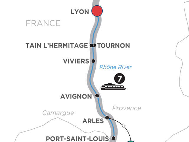 Day 1 Arles (Embarkation): onboard welcome receptionDay 2 Port-Saint-Louis: choice of excursion to a local oyster farm with tasting, or either guided hike or bike tour through the Camargue Regional Natural ParkDay 3 Arles: choice of guided tour in Arles, meet a local bullfighter, or guided hike through the Hell Valley and visit Carrière de Lumières, or painting workshopDay 4 Avignon: choice of guided tour in Avignon, or guided bike tour with wine tasting, or visit the Museum of Aromas and PerfumeDay 5 Viviers: choice of guided canoe trip down the Gorges de l’Ardèche, or guided hike in the Natural Reserve of Cirque d’Estre, or visit lock Bollène and its power plant, or guided speleological excursion with wine tasting in the caves, or visit the Crocodile Farm; evening guided tour of ViviersDay 6 Tain l’hermitage/Tournon–Lyon: choice of rail-bike tour, or guided hike in the vineyards, or guided tour of Tournon, or visit the Valrhona factory and museum; onboard cooking demonstration; evening guided tour of LyonDay 7 Lyon: choice of culinary tour, or Saucisson brioché culinary workshop, or guided hike in Parc de la Tête d’Or Day 8 Lyon (Disembarkation): your vacation ends this morning