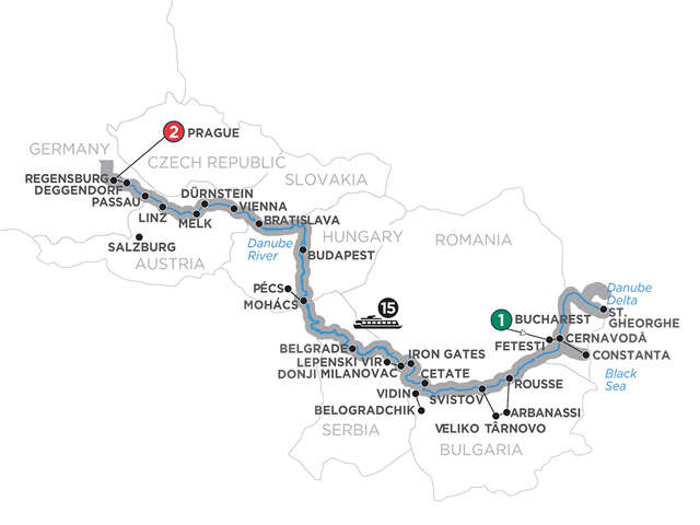 Day 1 Bucharest: welcome to BucharestDay 2 Bucharest—Fetesti (Embarkation): guided sightseeing in Bucharest; onboard welcome receptionDay 3 St. Gheorghe: excursion to Danube Delta: km 0 celebration Day 4 Cernavodă. Excursion to Constanta: guided sightseeing, visit the National History and Archaeological MuseumDay 5 Rousse. Excursion to Veliko Târnovo & Arbanassi: guided sightseeing, visit Tsarevet’s Fortress in Veliko Târnovo, and the Ethnographic Museum and the Church of the Nativity in Arbanassi; or guided sightseeing of RousseDay 6 Vidin—Belogradchik: guided sightseeing to Vidin’s fortress; excursion to Belogradchik, see the rock formations Day 7 Iron Gates—Donji Milanovac: cruise through the Iron Gates gorge; visit Lepenski Vir archaeological siteDay 8 Belgrade: guided sightseeing; lecture on boardDay 9 Mohács. Excursion to Pécs: guided tour and organ concert in PécsDay 10 Budapest: day at leisureDay 11 Budapest: guided tour, see Heroes’ Square; visit Gödöllö Royal PalaceDay 12 Bratislava: guided sightseeing, visit St. Martin’s Cathedral; lecture about royal dinasties in Europe, onboard Waltz lessonDay 13 Vienna: guided tour, see the Kuntskammer’s collection; choice of additional sightseeing, or a complimentary museum ticket; visit Schönbrunn PalaceDay 14 Dürnstein—Wachau Valley—Melk: choice of guided walk, or hike up to the castle ruins in Dürnstein; guided visit of the Benedictine Abbey in Melk or visit Arstetten Castle; wine tastingDay 15 Linz: guided walk or full day excursion Romantic AustriaDay 16 Passau: guided walkDay 17 Deggendorf (Disembarkation)—Regensburg—Prague: transfer to Regensburg, guided sightseeing; travel by motorcoach to PragueDay 18 Prague: guided sightseeing, see the Astronomical Clock and visit Hradčany Castle groundsDay 19 Prague: your vacation ends this morning
