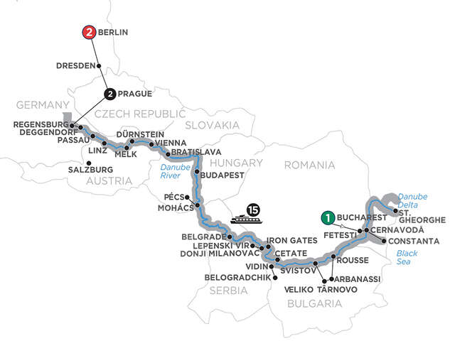 Day 1 Bucharest: welcome to BucharestDay 2 Bucharest–Fetesti (Embarkation): guided sightseeing in Bucharest; onboard welcome receptionDay 3 St. Gheorghe: excursion to Danube Delta: km 0 celebration Day 4 Cernavodă. Excursion to Constanta: guided sightseeing, visit the National History and Archaeological Museum in ConstantaDay 5 Rousse. Excursion to Veliko Târnovo & Arbanassi: guided sightseeing, visit Tsarevet’s Fortress in Veliko Târnovo, and the Ethnographic Museum and the Church of the Nativityin Arbanassi; or guided sightseeing of RousseDay 6 Vidin–Belogradchik: guided sightseeing to Vidin’s fortress and see the rock formations in BelogradchikDay 7 Iron Gates–Donji Milanovac: cruise through the Iron Gates gorge; visit Lepenski Vir archaeological siteDay 8 Belgrade: guided sightseeing; lecture on boardDay 9 Mohács. Excursion to Pécs: guided tour and organ concert in PécsDay 10 Budapest: day at leisureDay 11 Budapest: guided tour, see Heroes’ SquareDay 12 Bratislava: guided sightseeing, visit St. Martin’s CathedralDay 13 Vienna: guided tour, see the Kuntskammer’s collection; choice of additional sightseeing, or a complimentary museum ticketDay 14 Dürnstein–Wachau Valley–Melk: choice of guided walk, or hike up to the castle ruins in Dürnstein; guided visit of the Benedictine Abbey in Melk; wine tastingDay 15 Linz: guided walkDay 16 Passau: guided walkDay 17 Deggendorf (Disembarkation)–Regensburg–Prague: transfer to Regensburg, guided sightseeing; travel by motorcoach to PragueDay 18 Prague: guided sightseeing, see the Astronomical Clock and visit Hradčany Castle groundsDay 19 Prague–Dresden–Berlin: transfer to Dresden and city sightseeing; transfer to BerlinDay 20 Berlin: city sightseeingDay 21 Berlin: your vacation ends this morning
