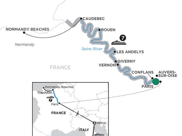 Day 1 Paris (Embarkation): onboard welcome receptionDay 2 Vernon—Les Andelys: choice of excursions to Giverny or Bizy Castle; onboard history lecture; choice of guided walk, or guided hike in Les AndelysDay 3 Caudebec: choice of excursion along the “Normandy Abbeys Route”, or hike in the Natural Park; lecture on boardDay 4 Caudebec: choice of full day excursion to Normandy landing beaches, or “A Taste of Normandy” excursionDay 5 Rouen: guided sightseeing related to the French Resistance, see the Astronomical Clock and visit the cathedral, or full day excursion to Vimy and Beaumont-Hamel Day 6 Conflans: choice of excursions to Auvers-sur-Oise, or Napoleon and Josephine’s Château de MalmaisonDay 7 Paris: choice of guided sightseeing, or “Heart of Paris” walk, visit Notre Dame Cathedral, or WWII theme tour with visit of the museum of Les InvalidesDay 8 Paris—Venice, Italy: flight to VeniceDay 9 Venice: guided sightseeingDay 10 Venice: full day at leisureDay 11 Venice–Rome: travel by high-speed train to Rome.Day 12 Rome: guided sightseeingDay 13 Rome: full day at leisure.Day 14 Rome: your vacation ends this morning.