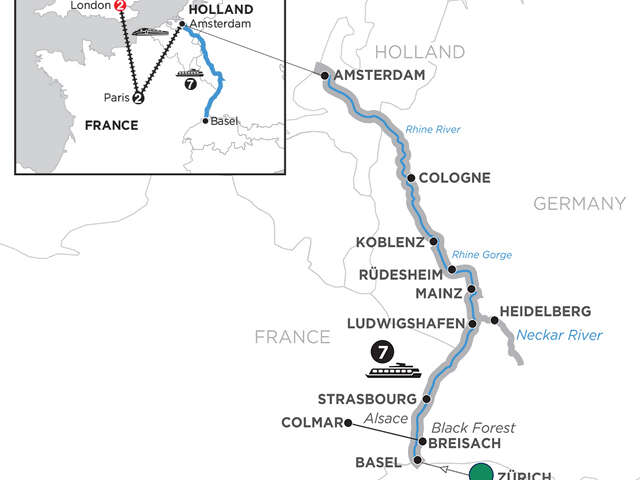 Day 1 Basel (Embarkation): onboard welcome receptionDay 2 Breisach. Excursion to Black Forest: choice of excursion to Black Forest, or guided tour in ColmarDay 3 Strasbourg: guided sightseeing, visit La Petite France district and the gothic cathedralDay 4 Excursion to Heidelberg. Mainz: guided tour of Heidelberg Castle, see the Great Vat; visit the Gutenberg Museum in MainzDay 5 Rüdesheim–Rhine Gorge–Koblenz: visit Siegfried’s Mechanical Musical Instrument Museum in Rüdesheim; special treat; scenic cruise through the Rhine Gorge; guided walk in KoblenzDay 6 Cologne: choice of “Cologne Highlights” walking tour, or Jewish Heritage walking tourDay 7 Amsterdam: canal cruiseDay 8 Amsterdam (Disembarkation)–Paris, France: travel to Paris by high-speed trainDay 9 Paris: guided sightseeingDay 10 Paris–London, England: travel to London by high-speed trainDay 11 London: guided sightseeingDay 12 London: your vacation ends with morning